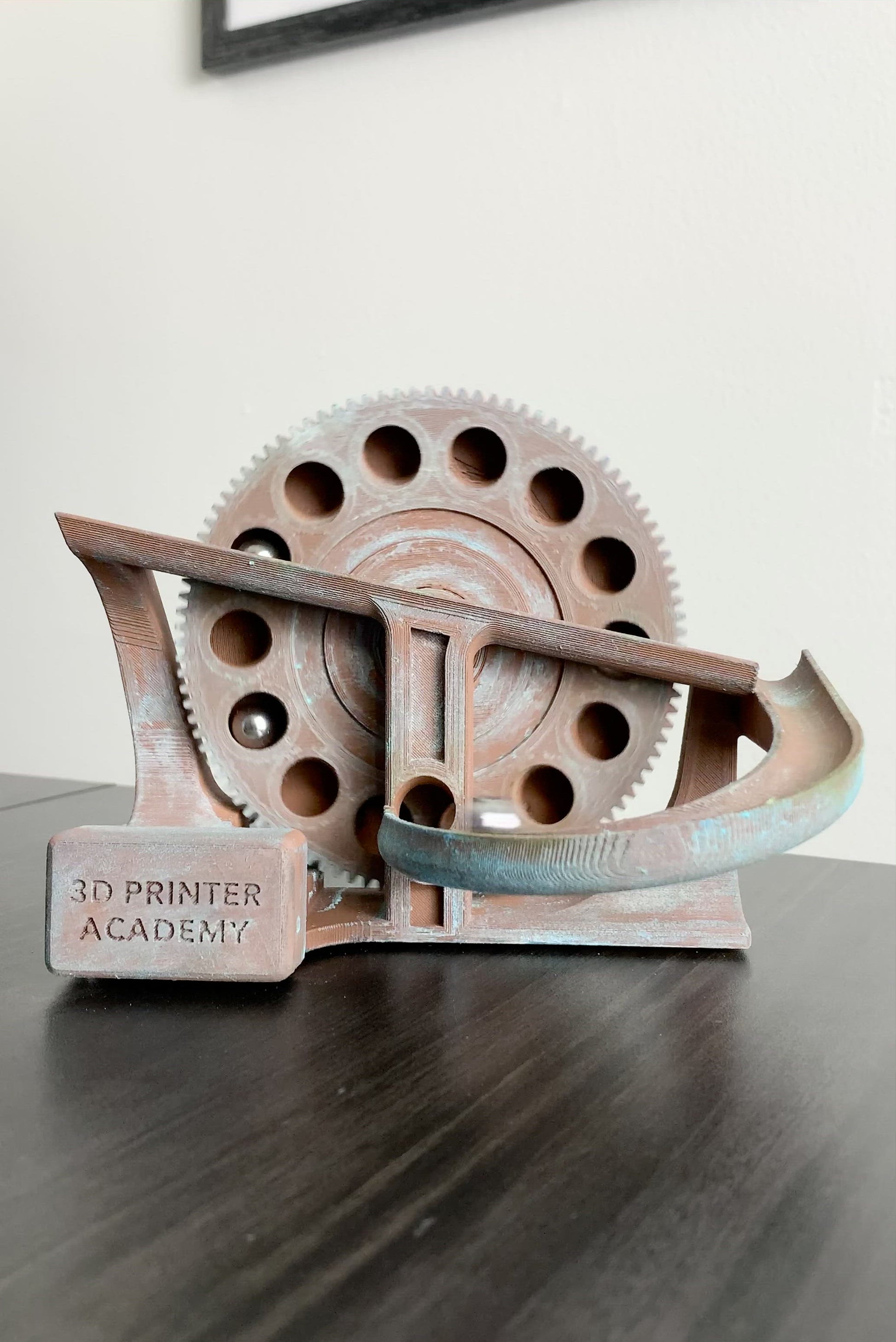 (We use oxidizing agents to give the copper PLA filament a nice blueish-green patina.)